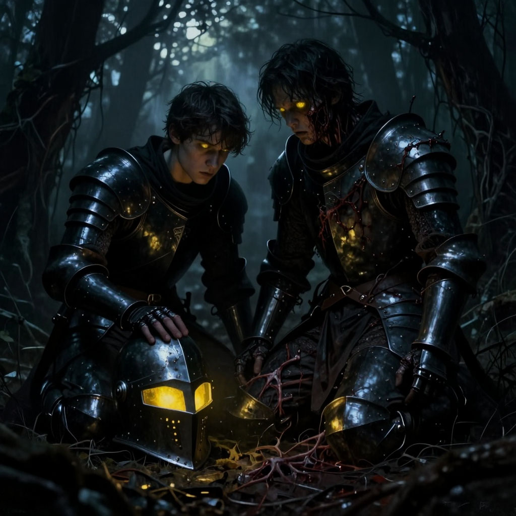На рассвете чёрный рыцарь поднялся. Он отряхнул мох с наплечников и пошёл на юг, туда, где сверкали белые доспехи. Внутри него, в тесной темноте, тихо плакал кто-то, кто когда-то мечтал стать рыцарем.