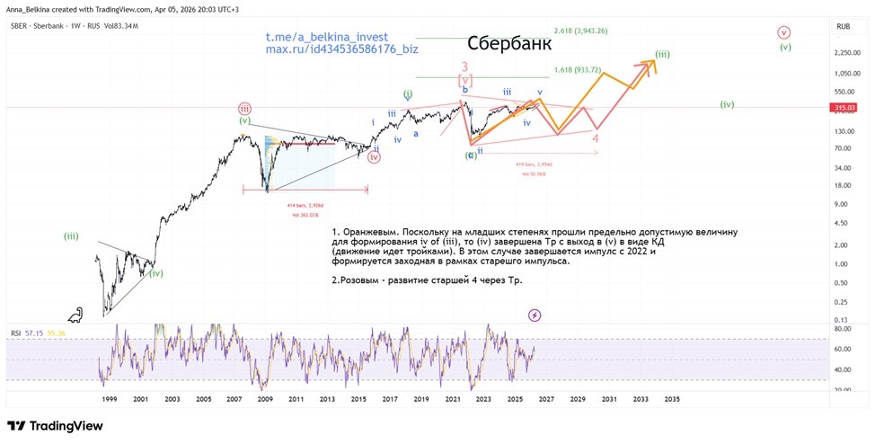 Поскольку на младших степенях цена уже прошла предельно допустимую величину для формирования iv of (iii), волна (iv) должна быть завершена через треугольник с последующим выходом в (v). Однако текущее движение развивается тройкой, что указывает на формирование волны (v) через конечную диагональ. 👉 В этом случае мы имеем дело с завершающимся импульсом с 2022 года, где далее формируется заходная в рамках старшего импульса. В альтернативном сценарии на старших степенях допускаю формирование треугольника в волне 4 старшей размерности. Этот вариант держался как дополнительный, с приоритетом на импульсный счёт. Вот разметка от ноября 2024: https://t.me/c/1978473870/7/311 🔹 По новостному фону: Сбер не растёт не из-за слабости, а из-за отсутствия новых драйверов. Основные факторы уже заложены в цену (прибыль, дивиденды), при этом высокая ставка продолжает сдерживать переоценку. 🔹 В отличие от ВТБ (который разберем далее в Закрытом канале), где рост носил скорее спекулятивный характер,