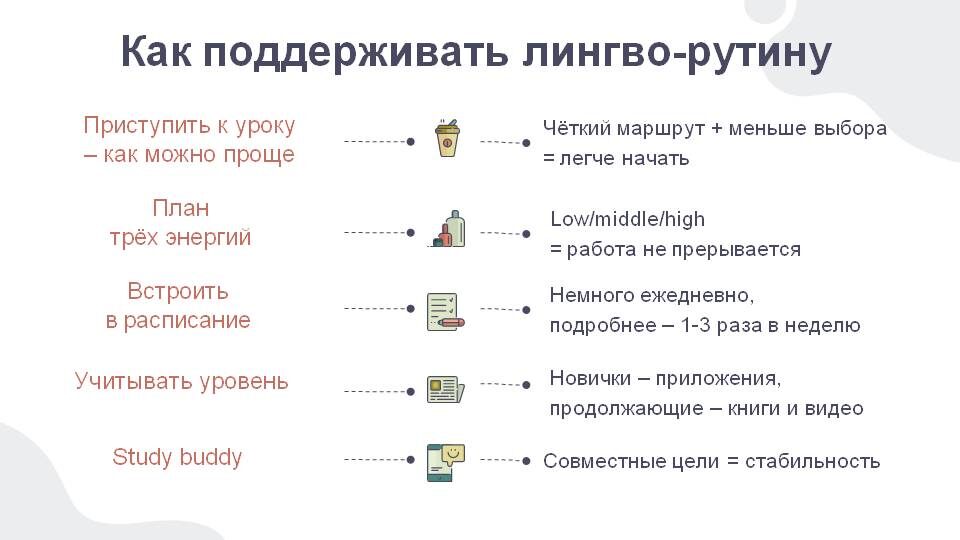 Вам будет гораздо проще учить язык, если выстроить систему, а не полагаться только на мотивацию (которая имеет свойство угасать). Делюсь рабочими способами, которые помогают не забрасывать английский, даже когда нет сил, времени или вдохновения. Подготовьте себе чёткий маршрут: какой учебник, приложение, курс, и в какой последовательности вы их открываете. Чем меньше выбора перед стартом, тем легче начинать занятие. Продумайте три формата занятий: Так вы не выпадаете из рутины и не накапливаете «учебные долги». Low-energy активности имеет смысл делать ежедневно — буквально 5–10 минут. А вот middle и high можно планировать по часу-другому хотя бы раз в неделю. Новичкам подходят карточки и приложения; продолжающим — книги, видео, оригинальные источники. Слишком сложные материалы — прямой путь к прокрастинации. Обмен прогрессом, вызовы, совместные мини-цели — всë это сильно держит в тонусе и помогает не сдаваться. Используете что-нибудь из этого для изучения английского?