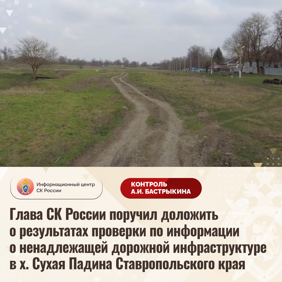 Глава СК России поручил доложить о результатах проверки по информации о ненадлежащей дорожной инфраструктуре в х. Сухая Падина Ставропольского края В СМИ и социальной сети сообщается о нарушении прав жителей хутора Сухая Падина Ставропольского края на качественную дорожную инфраструктуру. Длительное время автомобильная дорога в населенном пункте находится в непригодном состоянии: асфальтовое покрытие отсутствует, в период выпадения осадков грунтовое полотно размывается. В связи с этим проезд транспортных средств, в том числе экстренных служб, а также пешее передвижение граждан затруднены. Несмотря на указанное, мер к проведению ремонтных работ на протяжении нескольких лет не принимается. В СУ СК России по Ставропольскому краю организована процессуальная проверка. Председатель Следственного комитета Российской Федерации Александр Иванович Бастрыкин поручил и.о. руководителя СУ СК России по Ставропольскому краю Олегу Евгеньевичу Сидорову доложить о предварительных и окончательных резуль