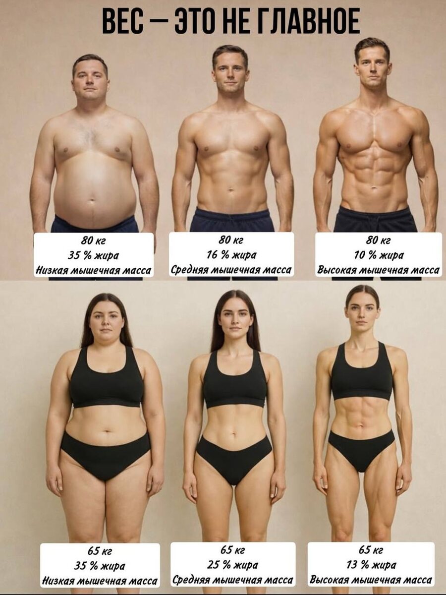 Два человека могут весить одинаково, выглядеть и чувствовать себя абсолютно по‑разному. Почему? Потому что «вес» — это сумма: мышцы, жир, вода, кости, содержимое ЖКТ.