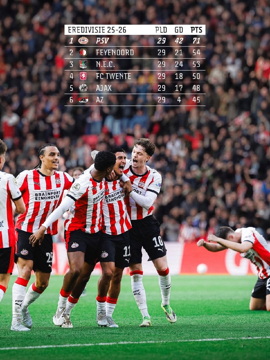 Это произошло после ничьей в матче между «Фейеноордом» и «Волендамом» в 29-м туре чемпионата Нидерландов. Роттердамский клуб с 54 очками лишился шансов догнать ПСВ (71 очко) за пять туров до окончания сезона. ПСВ выиграл чемпионат Нидерландов в третий раз подряд. Это 27-е чемпионство в истории клуба. ПСВ уступает только «Аяксу», который остается рекордсменом с 36 титулами. ⚽️ Подписывайтесь на нас в MAX