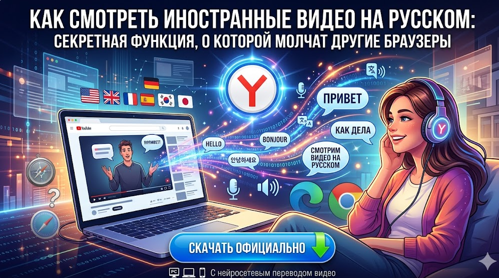 Что предлагают нам обычные браузеры вроде Google Chrome или Microsoft Edge? В лучшем случае — кривые автоматические субтитры, которые постоянно отстают от видео и отвлекают от картинки. Согласитесь, читать с экрана быстро бегущий текст, пытаясь уловить суть происходящего, — сомнительное удовольствие. Но что, если языкового барьера больше не существует? Появилась технология, которая на лету переводит и профессионально озвучивает любое иностранное видео на русский язык. И доступна она абсолютно бесплатно. Вам нужно лишь сменить свой привычный обозреватель и скачать Яндекс Браузер по официальной ссылке. Разработчики Яндекса внедрили в свой браузер мощнейшую систему искусственного интеллекта. Вам не придется устанавливать сторонние программы, оплачивать подписки сервисов-переводчиков или копаться в сложных настройках. Уникальная функция встроена прямо «в коробку». Работает это максимально просто: вы открываете ролик на иностранном языке, и вверху плеера появляется аккуратная кнопка «Переве