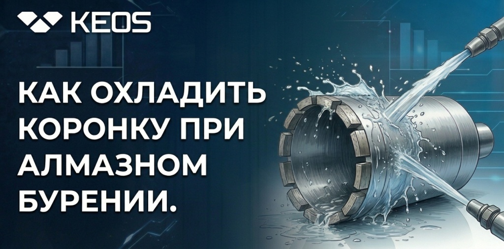 При алмазном бурении температура в зоне реза достигает 700–900°C. Алмазные зерна начинают разрушаться при 600–700°C, связка сегмента оплавляется. Без правильного охлаждения ресурс коронки сокращается в 3–5 раз, возрастает нагрузка на мотор и риск заклинивания. В материале рассмотрены два основных способа охлаждения — мокрый и сухой. Наиболее эффективный метод для профессионального бурения. Вода подается непосредственно в зону реза, выполняя три функции: охлаждение сегментов, вымывание шлама, пылеподавление. Требования к организации: Применение: открытые строительные площадки, промышленные объекты, работы, где допустимо наличие воды. Алмазные коронки KEOS для мокрого сверления. Применяется в условиях, где использование воды невозможно: жилые и офисные помещения с чистовой отделкой, вблизи электропроводки. Особенности метода: Режим работы: паузы каждые 10–20 секунд для рассеивания тепла, недопустимость превышения рекомендуемых оборотов. Алмазные коронки KEOS для сухого сверления. Выбор м