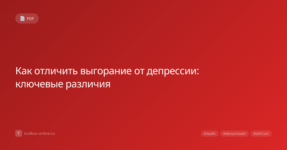 **Выгорание** — это состояние усталости, связанное с работой или стрессом. **Депрессия** — клиническое расстройство, влияющее на эмоции и поведение. Оба могут проявляться схожими симптомами, но причины и лечение различаются. Важно понимать разницу для правильного подхода. Если симптомы сохраняются более 2 недель или мешают жизни, необходимо консультация. Психическое здоровье важно, и наше онлайн-инструмент поможет оценить состояние. Помните: раннее обращение — ключ к выздоровлению. Не уверены, что испытываете? Используйте наш онлайн-инструмент для анализа симптомов и получения рекомендаций. Скачайте PDF-гайд на toolbox-online.ru и начните путь к восстановлению!