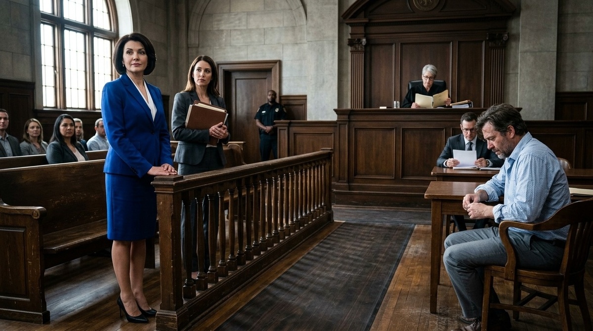 Суд назначили через месяц. Сергей пришёл в потрёпанной кожанке, с опухшим лицом. Рядом – молодой, нервный адвокат. Я – в тёмно-синем костюме и на каблуках, с Ириной Викторовной, которая напоминала ледокол.