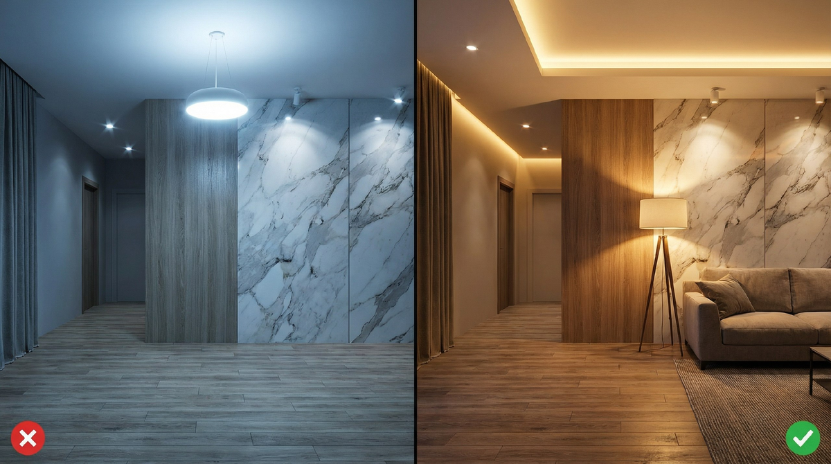 На старте многим кажется, что яркий белый свет — это просто “современно и чисто”. Но в жизни он быстро делает квартиру жесткой, плоской и неуютной.