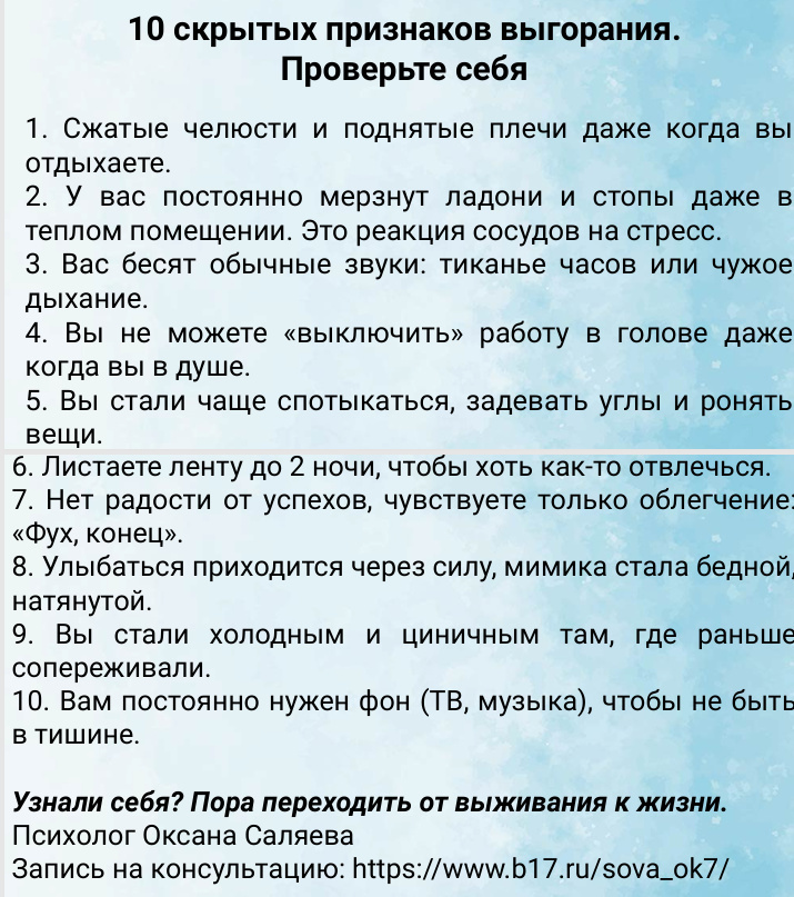 Выгорание это не приговор, а сигнал, что ваша стратегия «выживания через надрыв» больше не работает. Если вы узнали себя, не ждите, пока тело выключит вас принудительно через болезнь. 👉 Сохраните этот список как чек-лист (картинка ниже), чтобы вовремя з