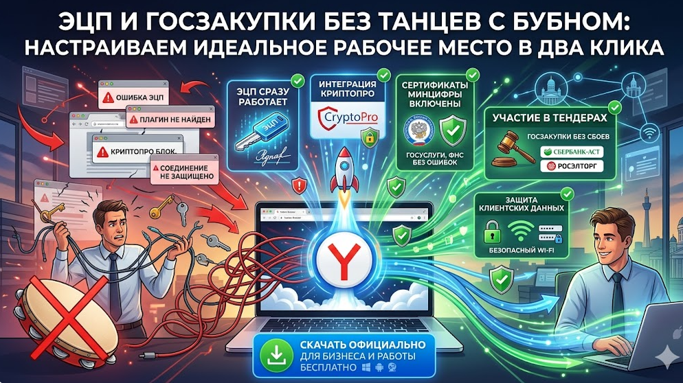 Жизнь современного специалиста, фрилансера или предпринимателя — это бесконечная многозадачность. Особенно это знакомо тем, кто ведет клиентские проекты: сегодня вы обсуждаете с заказчиком выбор технологического стека, завтра с головой уходите в разработку сложного личного кабинета с календарем бронирования, а вечером вспоминаете, что нужно срочно подписать закрывающие документы через ЭДО, отправить отчетность в налоговую или подать заявку на тендер. И именно на этапе бюрократии начинаются главные проблемы. Вы вставляете флешку с электронной цифровой подписью (ЭЦП), открываете привычный Google Chrome или Edge, пытаетесь зайти на портал, и система выдает ошибку. Плагины не работают, КриптоПро выдает сбои, а браузер блокирует страницу из-за «незащищенного соединения». Настройка рабочего места для электронного документооборота в обычных браузерах превращается в настоящие танцы с бубном. Но зачем тратить свои нервы и драгоценное время, если существует инструмент, в котором всё работает изн