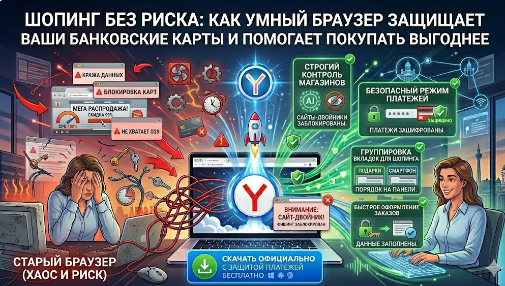 Сегодня мы заказываем в интернете всё: от продуктов на ужин до бытовой техники и авиабилетов. Это быстро и удобно, но вместе с ростом популярности маркетплейсов и интернет-магазинов активизировались и кибермошенники. Каждый день в сети появляются сотни сайтов-однодневок, которые маскируются под известные бренды, обещают невероятные скидки, а на деле просто воруют данные ваших банковских карт. Обычные браузеры никак не предупреждают вас об опасности — для них это просто очередная веб-страница. Если вы регулярно совершаете покупки онлайн, вам нужен инструмент, который не только сделает процесс выбора товаров удобнее, но и станет надежным сейфом для ваших финансов. Мы рекомендуем бесплатно скачать официальную версию Яндекс Браузера с технологией безопасных платежей. Рассказываем, как он изменит ваш подход к онлайн-шопингу. Главное правило безопасных покупок — никогда не вводить данные карты на сомнительных ресурсах. Но как отличить хороший сайт от мошеннического? Яндекс Браузер берет эту