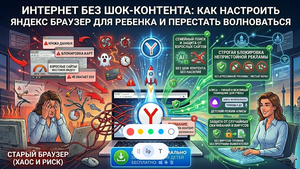 Современные дети осваивают смартфоны, планшеты и компьютеры раньше, чем учатся читать. Интернет нужен им для школьных докладов, просмотра мультфильмов и развивающих игр. Однако Всемирная сеть — это далеко не самая безопасная детская площадка. Даже если ваш ребенок ищет невинную информацию о динозаврах или смотрит прохождение любимой игры, стандартный браузер может внезапно подсунуть ему агрессивный рекламный баннер, видео с нецензурной лексикой или ссылку на мошеннический сайт. Настраивать сложные системы родительского контроля умеют далеко не все, а постоянно стоять у ребенка за спиной просто невозможно. Чтобы интернет приносил пользу, а не психологические травмы, мы рекомендуем использовать правильные инструменты. Бесплатно скачайте Яндекс Браузер по официальной ссылке и настройте безопасную среду для вашего ребенка всего за пару минут. В обычных поисковиках риск случайно наткнуться на контент 18+ крайне высок. В Яндекс Браузере существует встроенный «Семейный режим» поиска. Его можн