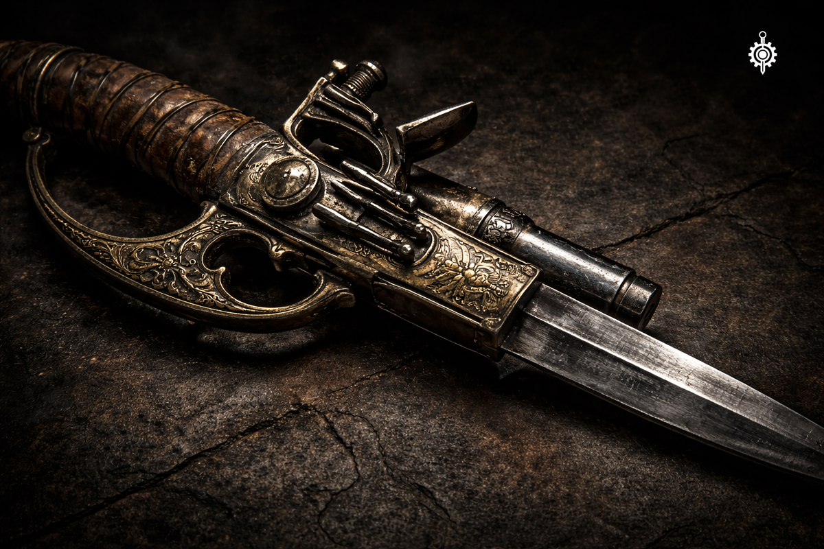 На протяжении трёх веков оружейники разных стран пытались решить одну задачу: совместить огнестрельное оружие с клинком в одном изделии. Идея возникала снова и снова — и почти всегда упиралась в одно и то же инженерное противоречие.