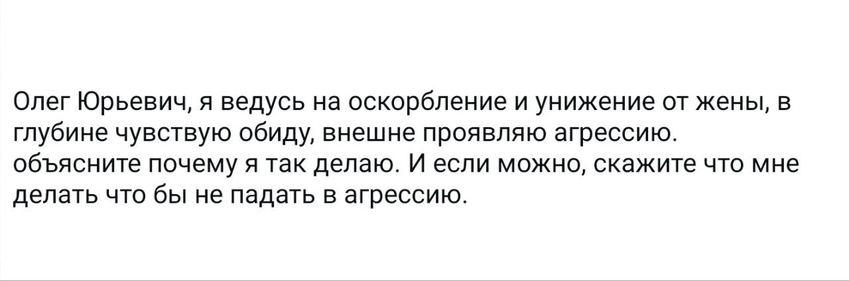 Здравствуйте, давайте разберёмся. Вы пишете: «Я ведусь на оскорбление, внутри обида, снаружи агрессия». Это классическая реакция, когда ваша граница нарушена, а другой способ защиты не найден. Важно понять, что агрессия в ответ на унижение — это не ваша «плохая черта», это автоматическая защита вашей психики. Но она разрушает отношения и вас самого. 🔴 Что происходит внутри? 1. Обида — это первая реакция вашего внутреннего Ребёнка. Вы чувствуете себя несправедливо обиженным, униженным, обесцененным. 2. Агрессия — это вторая реакция, которую запускает ваша психика, чтобы защитить эту уязвимую часть. Вы не можете выдержать чувство унижения, и вместо того, чтобы показать свою боль, вы нападаете. Это цикл: унижение - обида (боль) - агрессия (защита). Вы не виноваты, что он запускается автоматически. Но вы можете научиться его разрывать. ❗️ Конкретные способы не впадать в агрессию (тренируйте!): 1. Отделите унижение от личности. В момент, когда вы слышите оскорбительные слова, скажите