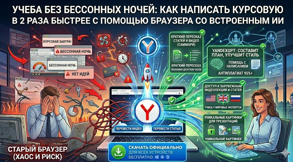 Студенческие годы — это не только лекции и новые друзья, но и вечная борьба с дедлайнами. Написание рефератов, эссе, курсовых и дипломных работ часто превращается в марафон без сна. Приходится перерывать горы информации, отсматривать многочасовые лекции, бороться со «страхом чистого листа» и пытаться уложить мысли в строгий академический формат. Обычно мы делаем это в стандартном браузере, который просто открывает страницы и ничем не помогает в самом процессе. Но технологии шагнули далеко вперед. Если вы хотите учиться эффективнее, тратить меньше времени на рутину и больше — на реальную жизнь, пора сменить инструмент. Мы настоятельно рекомендуем бесплатно скачать актуальную версию Яндекс Браузера с нейросетями по официальной ссылке. Это настоящий виртуальный ассистент студента, который заберет на себя половину вашей работы. Самый долгий этап в любой курсовой — это ресёрч. Чтобы найти один полезный факт, часто приходится прочитать 40-страничную статью на Википедии или отсмотреть полутор