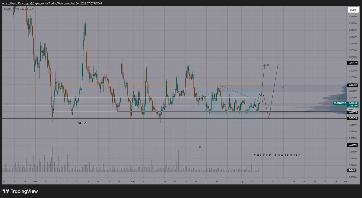 $DOGE Актив демонстрирует фазу консолидации, то есть "сжатие цены", что часто предшествует сильному движению. Подтвержденный уровень покупателя указывает на наличие интереса к покупкам в определенном ценовом диапазоне.В идеале увидеть бы наиболее предпочтительный сценарий для входа в лонг ложный пробой (вынос стопов) с последующей быстрой реакцией покупателей. Это позволит войти в позицию с выгодным соотношением риск/прибыль. 🔵Соблюдайте риски 🔵Не является ИИР MAX 𝑃𝑟𝑜𝑓𝑖𝑇𝐿𝑎𝑑𝑦