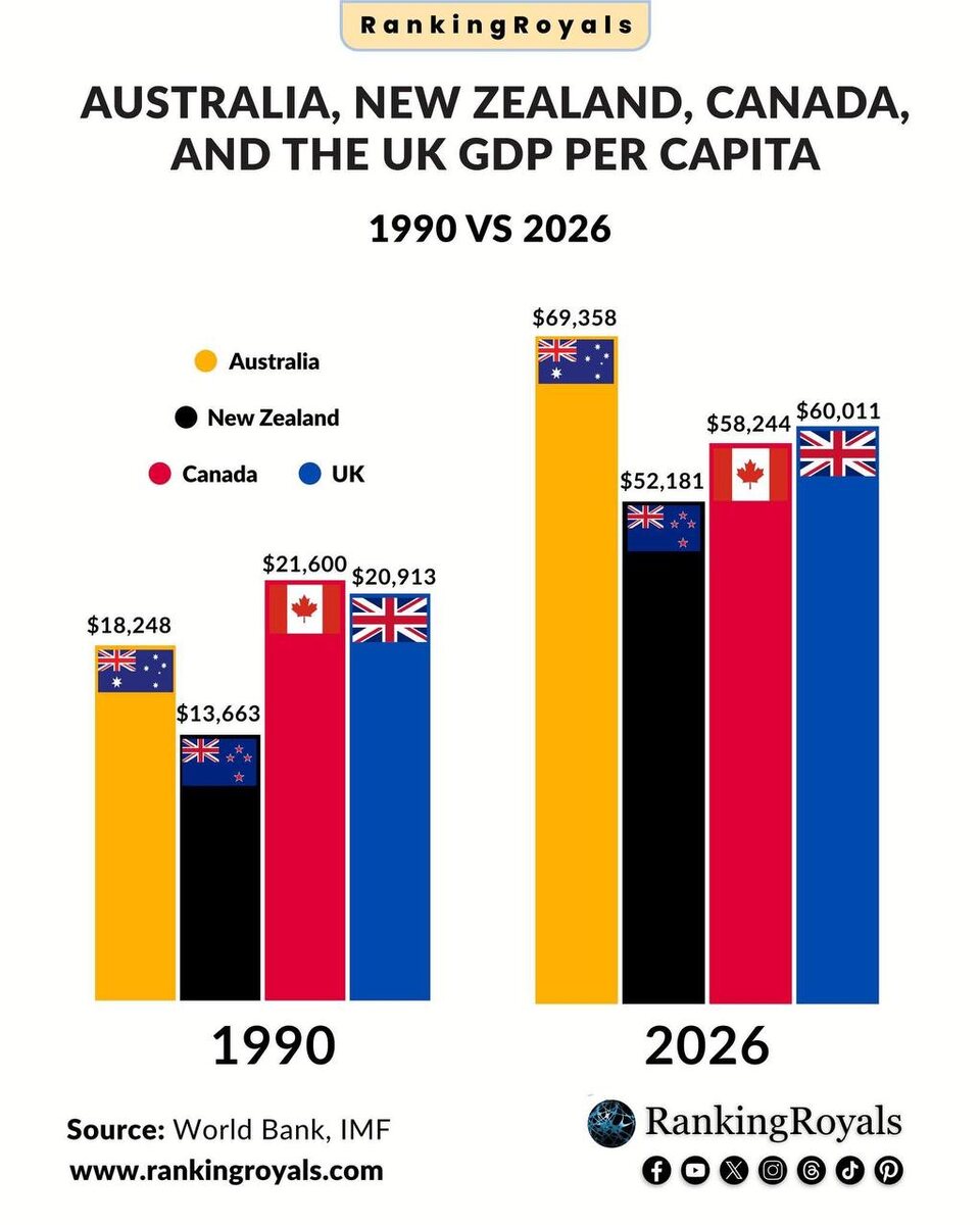 На графике видно, как поменялись показатели за 30 с лишним лет. Австралия была третьей из этой четверки, а стала первой. Канада разменялась не глядя с жарким коллегой - была первой, а стала третьей. Новая Зеландия, как крадущийся киви и притаившийся какапо, постепенно сокращает отставание от старших товарищей. В целом, по данным МВФ, Новая Зеландия - на 24 месте в мире по данному показателю. Лидеры списка Лихтенштейн и Люксембург, а из настоящих стран Ирландия, Швейцария и Исландия. #рейтингишмейтинги