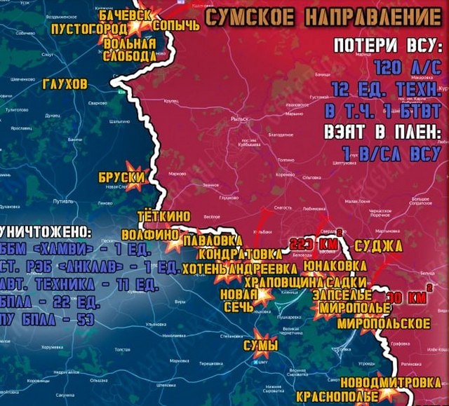 В группировке войск «Север» ВС РФ, которая создает полосы безопасности в Харьковской и Сумской областях, в том числе у границ КУрской области, рассказали об изменении текущей обстановки на линии фронта за минувшие сутки. 5 апреля на Сумском направлении Северяне продолжали ожесточенные бои, продвигаясь вглубь Сумской области в Шосткинском, Краснопольском и Сумском районах на 20 участках. Противник активных наступательных действий не предпринимал, продолжая накапливать резервы. Наши войска наносили удары по скоплениям ВСУ в окрестностях областного центра Сумы, а также возле Брусков, Вольной Слободы, Мирополья, Песчаного, Пустогорода и Храповщины. Из Донбасса в Сумскую область переброшены артиллеристы, пехотные подразделения противника доукомплектовываться насильно мобилизованными украинцами. Противник пытается сдержать наступление российской армии в направлении Краснополья за счет переброски сюда солдат с других участков фронта. Сергей Яшин, фото группировки войск «Север» ВС РФ Постоянны