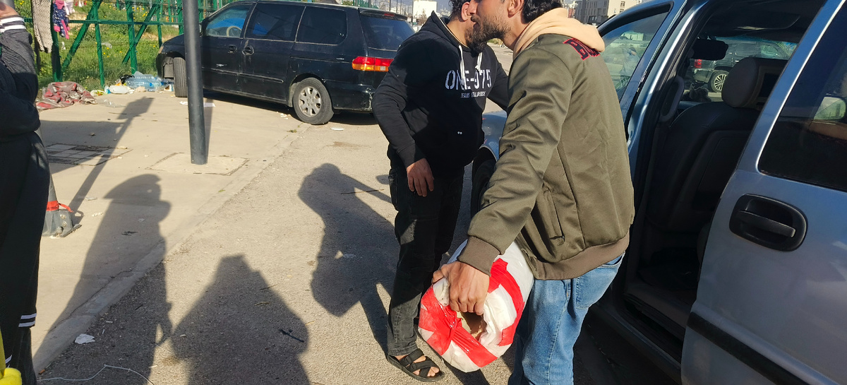 После того, как я всё, что могла, поснимала, приехал в Бейрут за мной сосед. Привез рулон клеенки для изоляции от дождей палаток беженцев. Клеенка эта продается на вес. Такой вот рулон стоит 130 баксов. Сколько там метров, пока точно не знаю. Сейчас объясню, почему. Процесс выгрузки: Вот. Мне сразу показалось, что он коротковат. Но я его только уже в Бейруте увидела. Соседу продавец сказал, что она там в четыре раза сложена, 4 метра. Начали распаковывать. В зелененьком Диана из Набатии. Она на этом пятачке за главную. Мы с ней сотрудничаем сейчас. Привозим нужное, она смотрит, кому что давать. Потому что из машины когда раздаешь, все всё хватают. И, в большинстве случаев, те, кому это действительно было нужно, не получают его. Короче, оказалось, что продавцу на сладе работники не тот рулон дали. В этом ширина не четыре, а всего два метра. Если склеивать, будет течь всё равно. Мы позвонили, показали, что рулон не тот. Нам обещали его заменить, но, скорее всего, будет доплата. Водитель