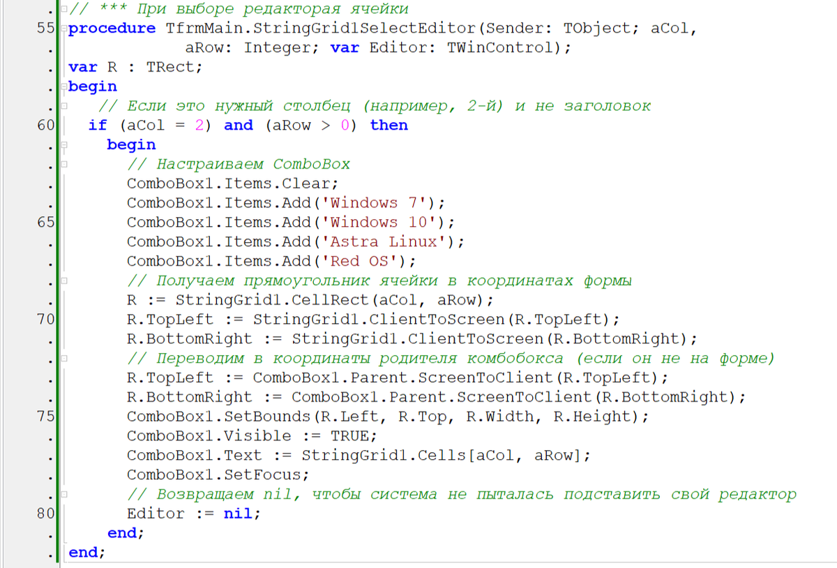 В Delphi и Lazarus, когда вы используете таблицы для ввода-вывода данных, иногда (впрочем, довольно часто) необходимо, чтобы в каком-то столбце была возможность не просто вводить текст, а выбирать значение из списка. При работе с базами данных это можно сделать, например, с помощью TDBGrid с полем lookup. Но, если вы не используете базу данных, а таблица вам нужна для отображения каких-то временных данных или для выгрузки в файл (загрузки из файла), то проще использовать TStringGrid. Однако в таблице этого вида нет стандартных возможностей сделать ячейку с выпадающим списком. Что же делать? Без паники. Потому что всегда есть нестандартные решения. Об одном из таких решений я сегодня расскажу. Основная идея: При начале редактирования ячейки вы можете подставить вместо стандартного редактора (TEdit) компонент TComboBox, наполнить его нужными значениями и после выбора записать результат в ячейку. Как это сделать? 1) Разместите на форме TStringGrid и TComboBox. Комбобокс можно сделать неви