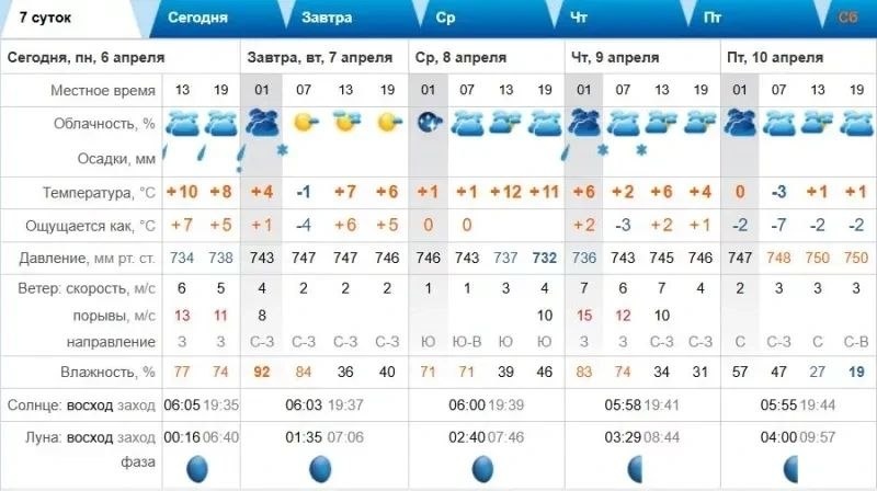 Сегодня, 6 апреля, днём столбик термометра поднимется до +10, в течение суток пасмурно и небольшой дождь, ветер западного направления до 13 м/с. Во вторник ночью +4, утром похолодает до -1 и не исключен небольшой снег. Днём +7, облачность переменная, без осадков, ветер сменит направление на северо-западное и не более 2 м/с. Среда станет самым тёплым днём "пятидневки" - ночью +1, днём +12, значительная облачность, без осадков, ветер юго-восточный 3 м/с, к вечеру его порывы достигнут 10 м/с. В четверг в тёмное, в светлое время суток +6, хотя в утренние часы +2, небо станет пасмурным, возможен небольшой снег, ветер западный до 15 м/с, к вечеру он станет северо-западным и 10 м/с. В пятницу довольно прохладно - ночью 0 градусов, утром -3, днём +1, облачно, осадков синоптики не прогнозируют, ветер северный не более 3 м/с. 🇷🇺 Запад24 в МАХ ™️Запад24 в ВК 🌐 Наш сайт