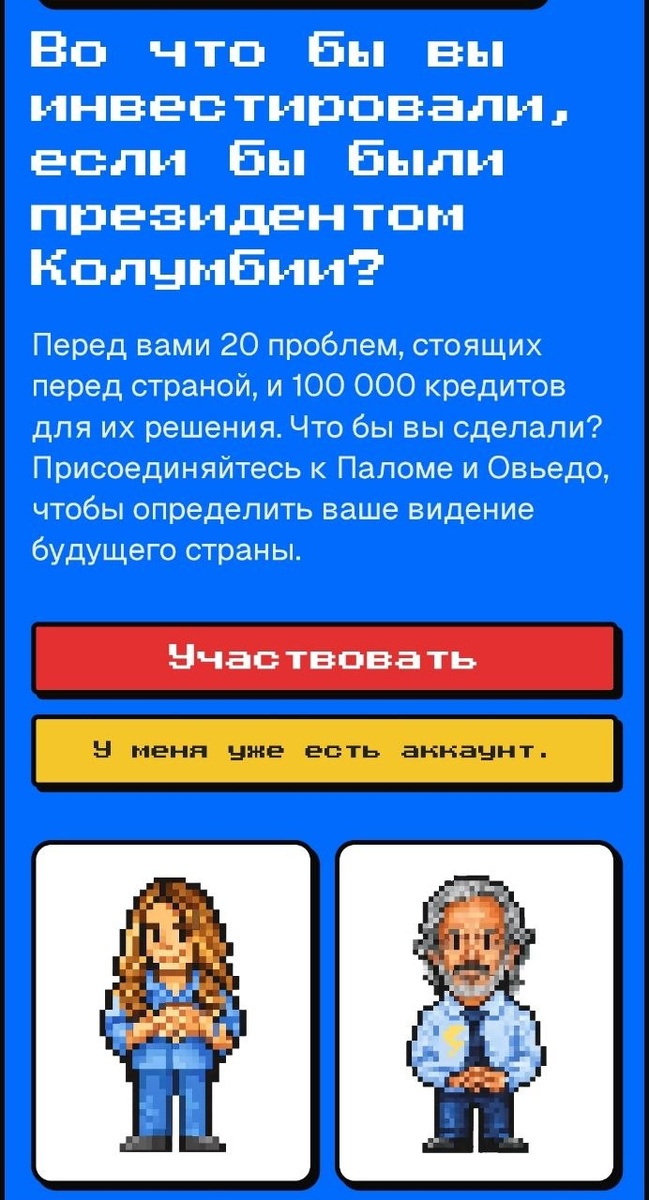: "У Колумбии много проблем. Пришло время расставить приоритеты в том, что действительно важно для людей. Мы хотим услышать тебя. Помогите нам определить приоритеты страны. Ваш голос имеет значение, ваше решение имеет значение, перейдите по ссылке https://sumando.palomapresidente.com.co/ Примите участие, и давайте вместе построим лучшую страну. Присоединяйся!" Для тех, кто не будет переходить по ссылке, отдельно прикрепляю скриншот, чтобы оценить дизайн сайта.