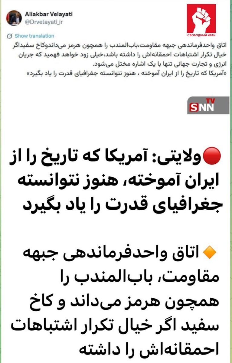 💥 Советник верховного лидера Ирана Али Акбар Велаяти заявил, что в случае новых ошибок США в Тегеране допускают перекрытие стратегического пролива. По его словам, Баб-эль-Мандеб для фронта сопротивления — такой же рычаг, как Ормуз. (SNN) Подпишитесь на канал