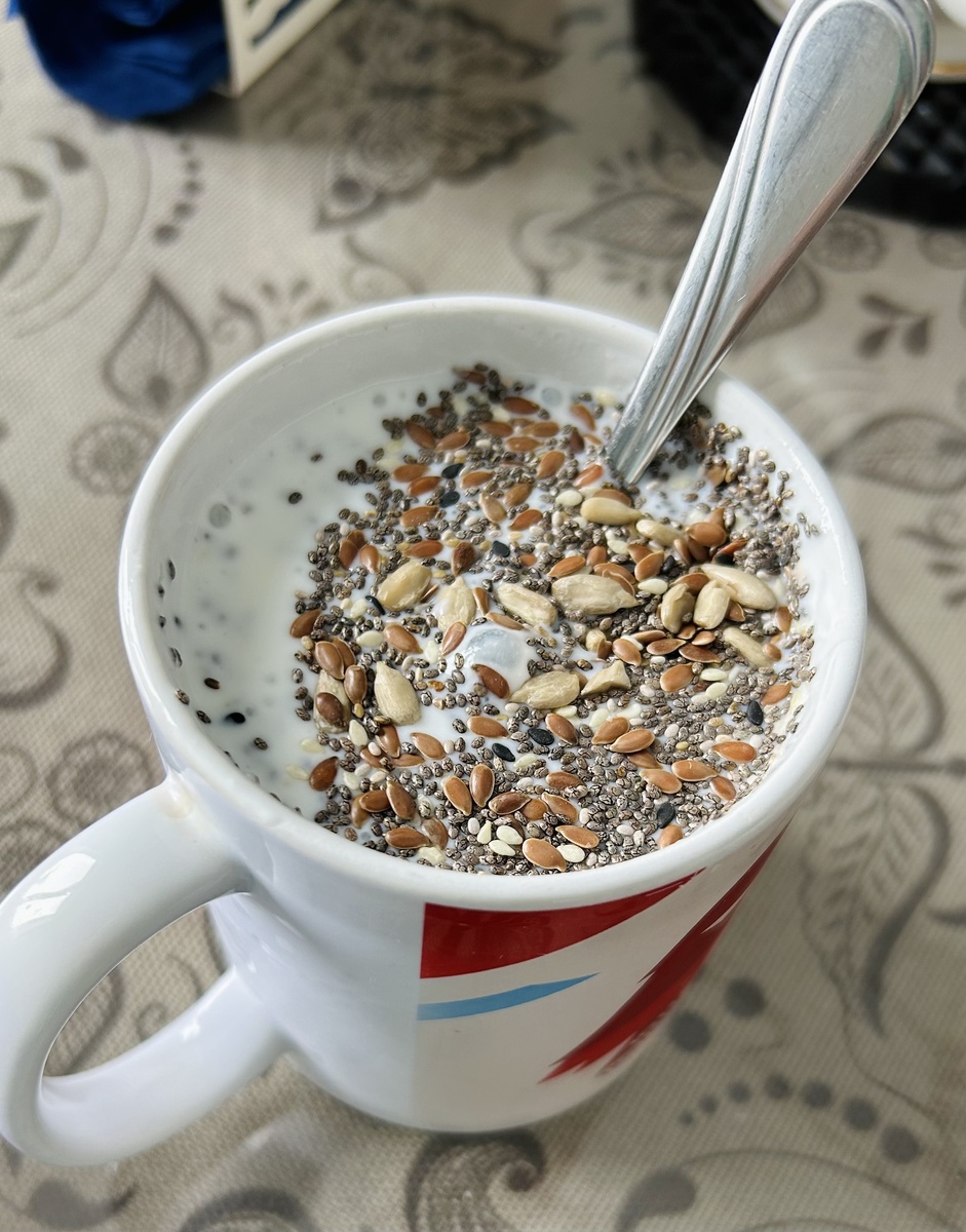 Очень часто я на завтрак делаю себе кефир с семенами (смесь для салата + чиа). Это очень вкусно и питательно. )