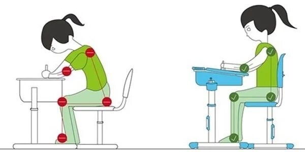 Усадите ребенка прямо, без напряжения: ➡️Бедра и голени — 90°, стопы прижаты к полу. ➡️ Между краем стола и грудью — кулак ребенка (избыточное расстояние заставит тянуться). ➡️Край стула не давит под коленями (зазор 2–4 см). ➡️Взгляд падает на середину тетради слегка сверху вниз. Что покупать? Растущая мебель или обычная? 🔴Лучшее решение растущий стул с регулировкой высоты и спинки + регулируемый стол. Они служат 5–7 лет. 🔴Если бюджет ограничен, купите обычный стол высотой 52–56 см (для роста 110–120 см) и отдельный ортопедический стул с газлифтом или растущий стул. 🔴Трансформер «парта + стул» удобен, но проверьте: стул не должен быть жестко привязан к столу, иначе не отодвинуться. ✖️Чего категорически избегать ☀️Компьютерные кресла с мягким сиденьем и прогибом — они расслабляют мышцы спины. ☀️Слишком глубокие стулья (ребенок не достает до спинки). ☀️ Столы на колесиках (неустойчивы). ☀️Фиксированная мебель «на вырост» — если ноги не достают до пола, через месяц сформируется