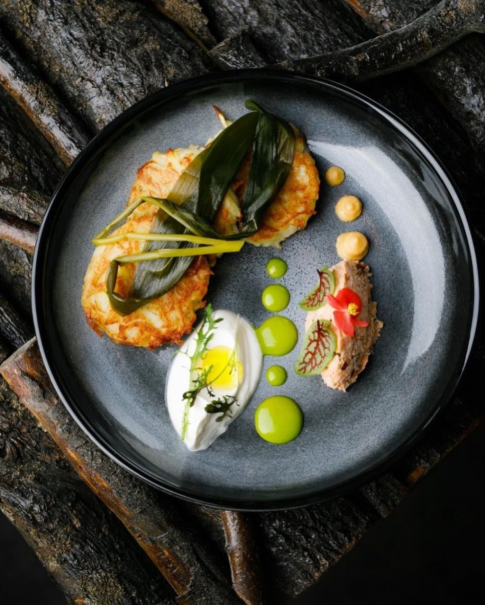 ): 1 - картофельные драники с копченой форелью и колбой 2 - обской судак, пойманный в сети из слоёного теста с мочёной ягодой и облепиховым гелем 3 - ребро пятнистого оленя с пюре из запеченного картофеля 4 - кролик конфи и тыква в трех текстурах.