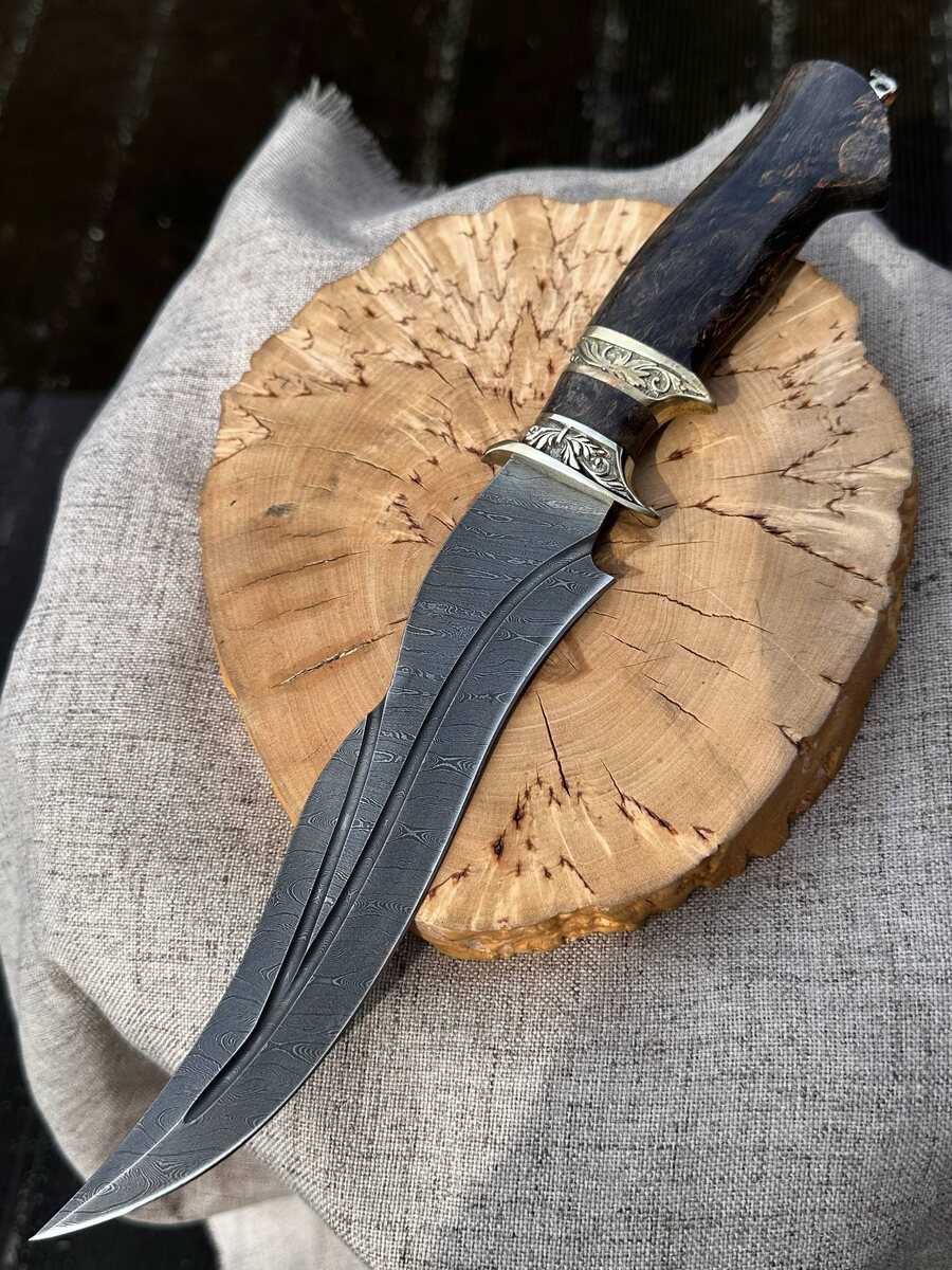 🗡️ 950 слоёв дамасской стали, фрезерованные долы и твёрдость 62 HRC — этот клинок создан для настоящих ценителей ручной работы. Каждый изгиб ножа — результат труда мастеров в третьем поколении, а фирменная заточка «в бритву» гарантирует идеальное резание. 🔸 Рукоять — стабилизированная карельская берёза (коричневая) и мельхиор. 🔸 Гарда — травмобезопасная, для вашего спокойствия в любых условиях. 🔸 В комплекте ножны из натуральной кожи (доступен вариант формованных ножен +8000 руб). Для кого? — Охотники, рыбаки, туристы, коллекционеры, подарок для мужчин и женщин, ценящих качество и стиль. 🔥 Цена по акции — 23.499 руб. _Обычная цена: 27588 руб._ Арт: 10819-1 ✍️ Заказывайте прямо сейчас: — Пишите в Telegram: [@Nazarklinokbot](https://t.me/Nazarklinokbot) — WhatsApp: [ +7 910 134 3831](https://wa.me/79101343831) #дамасскаясталь #ручнаяработа #эксклюзив #настоящийнож #подарокмужчине #охота #рыбалка)
