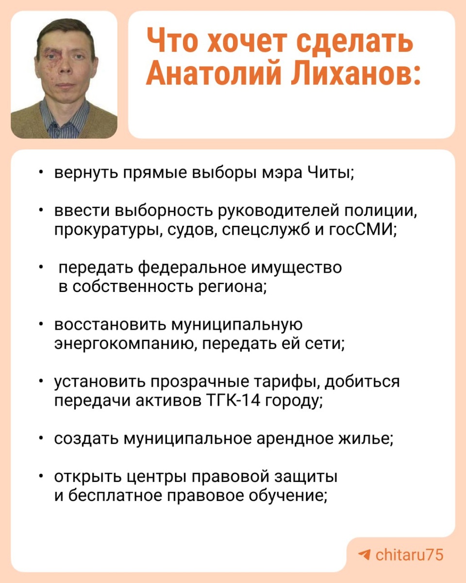Анатолию Лиханову 54 года. Родился в Чите, в 2001 году окончил Сибирский университет потребительской кооперации в Новосибирске по специальности «бухгалтерский учет, экономика и управление на предприятии». После учебы работал бухгалтером в читинских компаниях. Занимался боксом в центре «Спартак». В графе «сфера деятельности» — прочие, а в графе «место работы» информации нет. В «должности» написано «уход за нетрудоспособными гражданами». Себя он указал сторонником партии «Единая Россия», от которой и зарегистрировал свою кандидатуру на предварительное голосование. О себе Лиханов пишет, что помогает нетрудоспособным гражданам и инвалидам: Делюсь накопленным опытом, экономическими знаниями, содействую в развитии детского спорта, реализации инициатив в интересах развития личности, развития города и Забайкалья. В графе «о себе» Лиханов написал большой перечень инициатив. После выборов в Госдуму он хочет провести региональный референдум по введению инвестиционного сбора с добывающих и эне