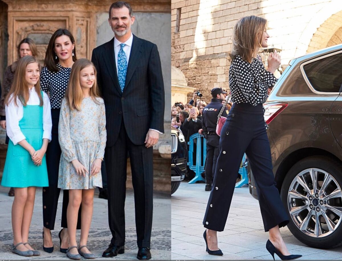 Пасха для испанской королевской семьи давно связана с одним местом. Каждую весну король Филипп VI, королева Летиция и их дочери приезжают на Майорку, где в кафедральном соборе Пальмы проходит пасхальная месса. Но этот год стал исключением, королевская семья не приехала на празднование, поэтому предлагаю рассмотреть лучшие образы прошлых лет. Один из моих любимых образов - это выход Литиции в 2018 году. В 2018 году Летиция выбрала образ, который идеально вписался в атмосферу острова. В нем чувствовалась легкость курортной весны и одновременно привычная для нее точность силуэта. В центре ансамбля оказались темно синие брюки Hugo Boss с высокой талией. Декоративные металлические пуговицы по бокам напоминали детали морской формы. Благодаря этому силуэту образ получил едва заметный морской характер, который всегда особенно уместен на Майорке. К брюкам королева добавила шелковую блузу Carolina Herrera в белый горох. Внимательные наблюдатели королевского гардероба сразу узнали эту вещь. Лет