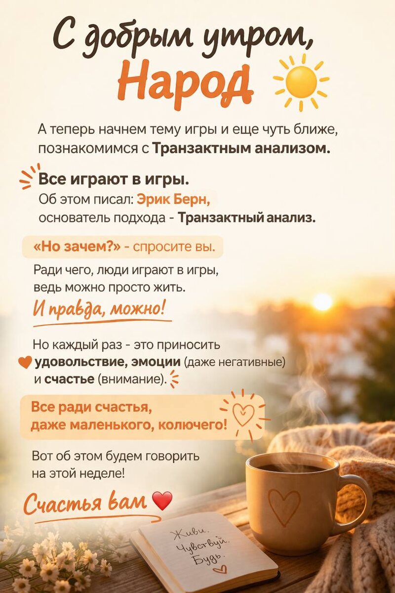 ☀️ А теперь начнем тему игры и еще чуть ближе, познакомимся с Транзактным анализом. Все играют в игры. Об этом писал: Эрик Берн, основатель подхода - Транзактный анализ. «Но зачем?» - спросите вы. Ради чего, люди играют в игры, ведь можно просто жить. И правда, можно! Но каждый раз - это приносить удовольствие, эмоции( даже негативные) и счастье ( внимание). Все ради счастья, даже маленького, колючего! Вот об этом будем говорить на этой неделе! Счастья вам❤️ #новыйдень #живемвсейчас #счастье