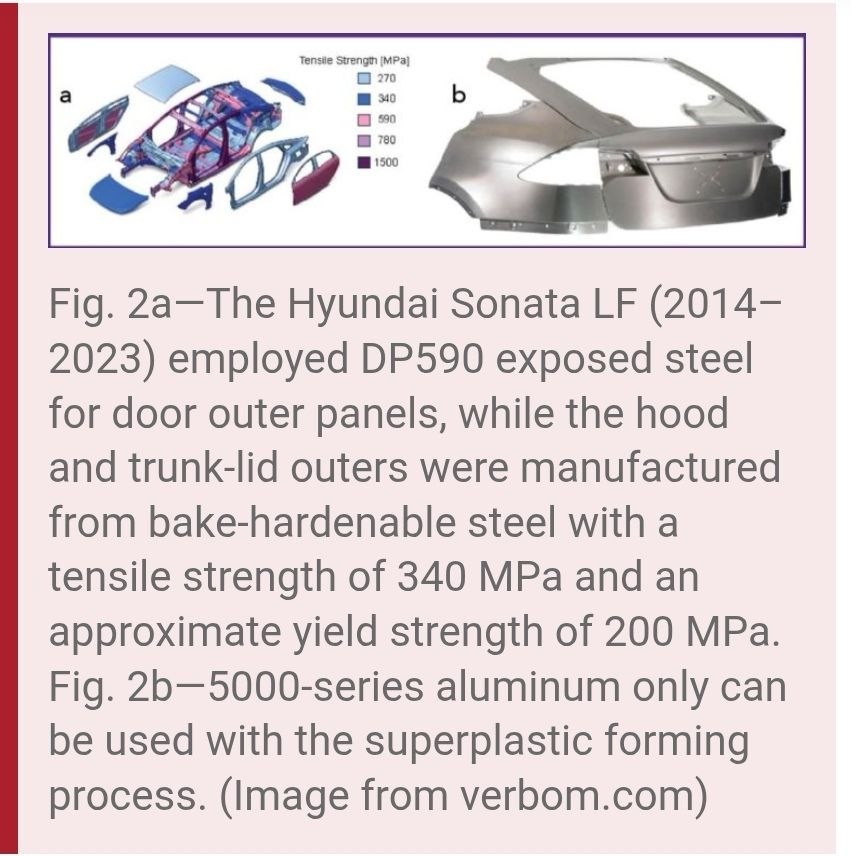 ). Вторая часть. Рис.2a – на Hyundai Sonata LF (2014-2023) применялась двухфазная сверхвысокопрочная сталь для наружных панелей дверей, тогда как наружная панель капота и багажника штамповались из высокопрочных термоупрочняемых сталей с пределом прочности 340 МПа и приблизительным пределом текучести 200 МПа. Рис.2b – алюминиевые сплавы 5000 серии для наружных панелей кузова могут применяться только в процессе SPF (суперформовки). «Последние достижения включают в себя использование двухфазных сверхвысокопрочных сталей для навесных элементов некоторых автомобилей, таких как Hyundai Sonata (рис.2a), также на которой применялись стали DP490 или DP590 для панелей крыши и наружных панелей дверей. Хотя это встречается редко, на некоторых моделях используется алюминиевый сплав AA50803 для наружных панелей кузова, получаемых путем процесса SPF. Этот подход обычно применяется для мелкосерийных сверхдорогих автомобилей (рис.2b), включая несколько действующих моделей Bentley, Mercedes SLS AMG (