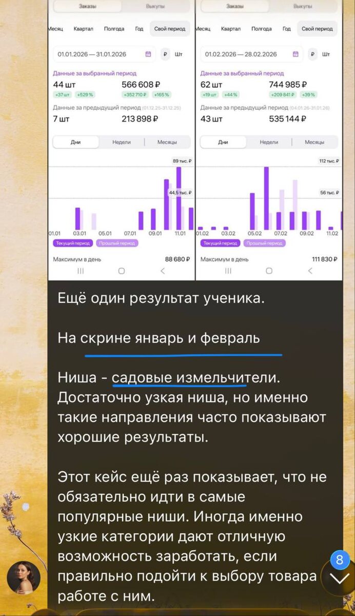 ! 🤩 Кто бы мог подумать, что садовый измельчитель принесет такие крутые результаты? Это еще раз подтверждает: нет «плохих» товаров, есть отсутствие системы. Маша прошла путь новичка по нашим урокам: 🔹 Выбрала нишу через анализ, а не «пальцем в небо». 🔹 Разобралась с логистикой из Китая. 🔹 Настроила продажи под присмотром админов. Доступно в тарифе «WB+ Китай» всего за 11990 рублей или выбирай тариф «КОМБО» за 15990₽ Один раз оплатили — и пользуетесь всеми знаниями без доплат. 💎 Хватит работать «на дядю», начни строить свою финансовую свободу уже сейчас. 💸 ❤️ Пиши мне, всё расскажу и открою доступ! @Markel_son