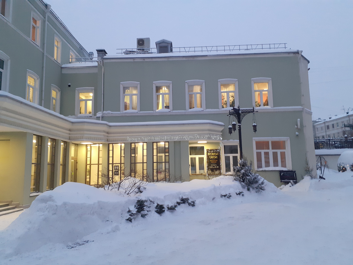 Само кафе в размещается в подвальном помещении в углу монастырской территории, при входе со стороны Рождественского бульвара. Немножко снежных пейзажей вам в ленту, заодно.