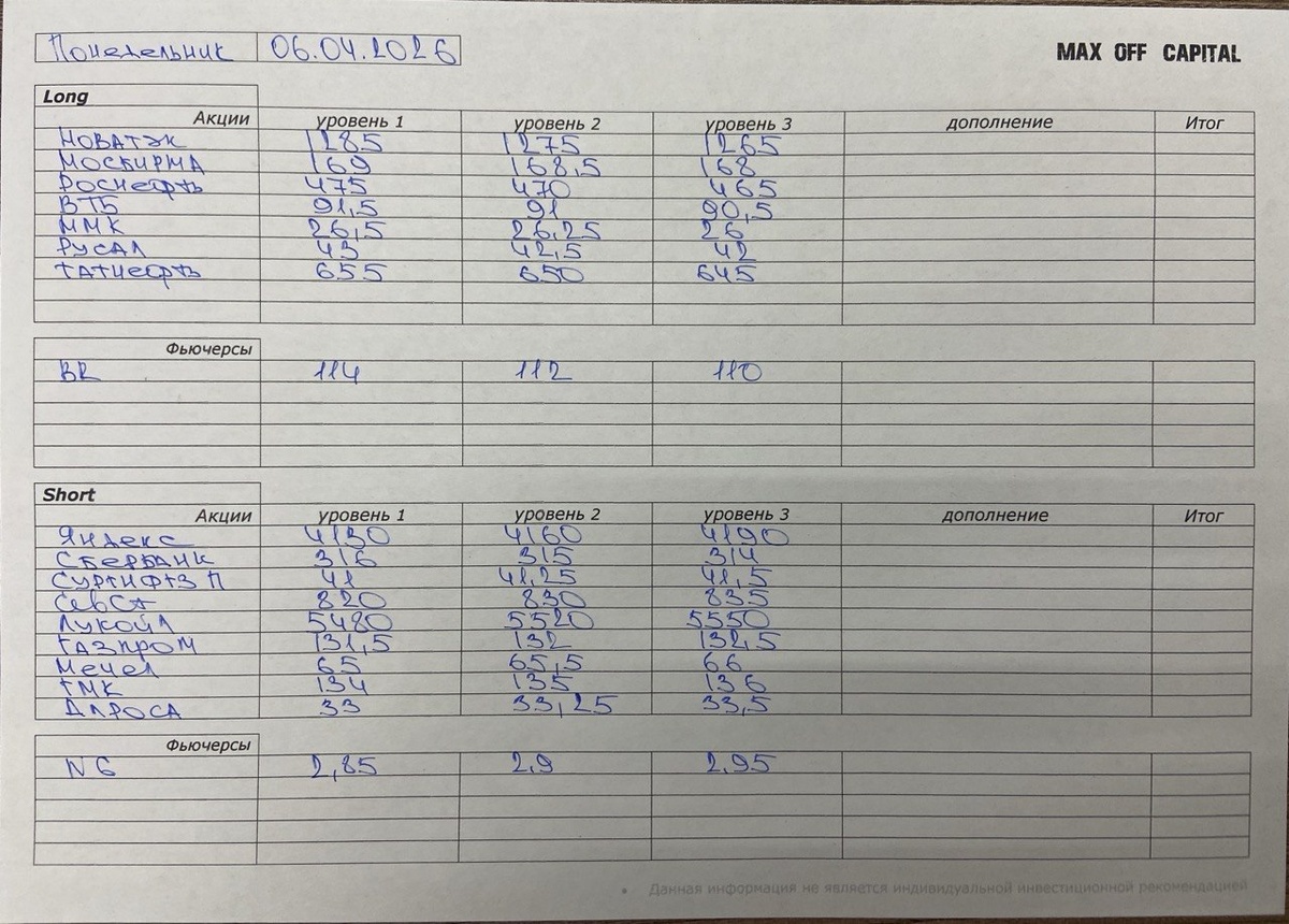 ✅ РЕКОМЕНДАЦИИ НА СЕГОДНЯ ➡️ Личный совет 👍 Сегодняшний день в PRO ▫️ Наши РЕСУРСЫ 😉 Стратегия ЗАДЁРГА 😉 Как пользоваться рекомендациями 😉 Как пользоваться ATR 😉 Видео моих сделок 😉 Куда ставить СТОП 😉 Дневник трейдера 😉 Как определить точку входа Уровни (часть 1) Уровни (часть 2) ТОЧКА ВХОДА Часть1 ТВХ Пробой ТВХ ЛП1Б (ложный пробой 1 баром) ТВХ ЛП2Б (ложный пробой 2 барами) ТВХ СЛП (сложный ложный пробой) ТВХ Отбой 1 баром ТВХ Отбой 2 барами ТВХ Дополнение Как рассчитать ATR Таблица рсчёта ATR Вероятности на рынке (часть1) Вероятности на рынке (часть2) Худшие дни для торговли на Бирже Зачем нужен индекс ММВБ Хватит делать эту ошибку Как работает крупный участник Что такое сильнее рынка Кто за кем ходит Как выбрать направление Где смотреть ИНДЕКСЫ и ТОВАРЫ 💬 Бесплатный | Чат - ПЕРЕЙТИ ❗️Помним, сегодня Понедельник и пятничные закрытия могут быть всего лишь фиксацией прибыли ! #рекомендации