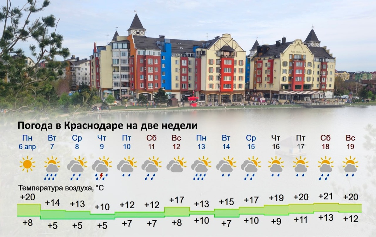 С 6 по 19 апреля в Краснодаре ожидается тёплая, но дождливая погода. В первую неделю температура днём составит +10…+20 °C, ночью +5…+8 °C. После тёплого и солнечного начала погода испортится – пройдут дожди, возможны грозы, а к выходным снова потеплеет. Во вторую неделю сохранится влажная погода с частыми дождями, при этом температура останется комфортной – днём около +15…+21 °C, ночью +7…+13 °C. К концу недели станет заметно теплее, несмотря на кратковременные осадки. Подробнее: https://краснодарскийкрай.рф/news/prognoz-pogody-v-krasnodare-na-dve-nedeli-s-6-po-19-aprelja-2026-goda.html Прогноз погоды на неделю: https://краснодарскийкрай.рф/pages/weather-forecast.html #погода #прогнозпогоды #температура #осадки #климат #метеопрогноз #краснодар #краснодарскийкрай