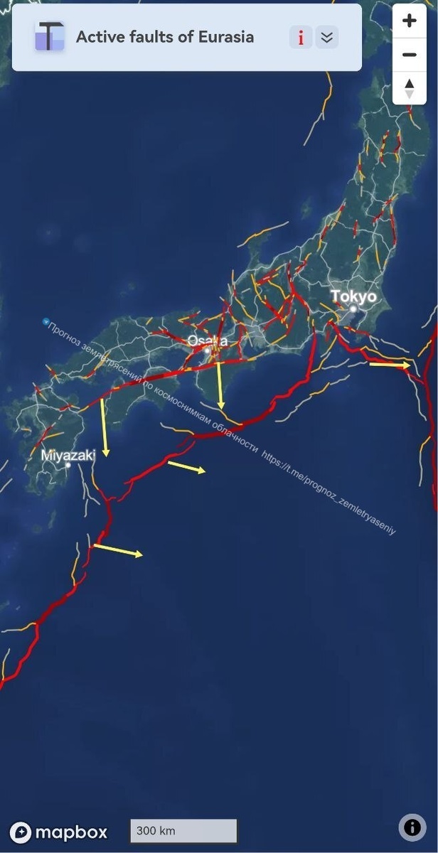 Согласно этому есть вероятность землетрясения с магнитудой М6.2-7.2 до 15 апреля. ===== Two cloudy indicators were observed at night to the southeast of the Japanese islands. According to them, there is a possibility of an earthquake with a magnitude of M6.2-7.2 before April 15.