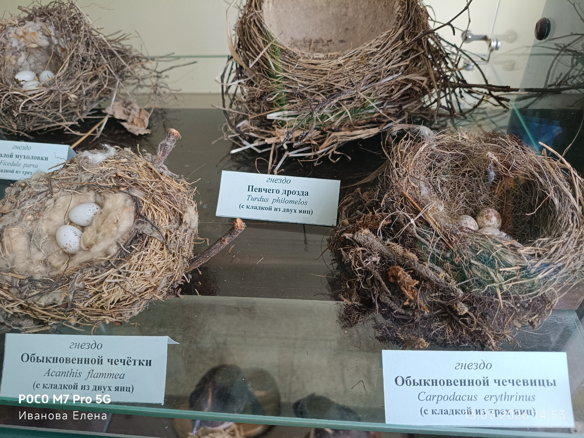 Красноярский край — обширный регион с разнообразной природой, где обитает множество видов птиц. Среди них есть небольшие пернатые, чьи гнёзда и яйца выделяются миниатюрными размерами. Рассмотрим двух представителей — чечевицу и варакушку. Фото гнезд сделаны автором канала в Красноярском краеведческом музее. Чечевица Общая характеристика Чечевица — небольшая птица семейства вьюрковых, размером с воробья (длина тела около 12–15 см). Самцы имеют яркое красно-малиновое оперение на груди и голове, самки — более скромное, буровато‑серое. Гнездо Яйца Варакушка Общая характеристика Варакушка — небольшая певчая птица из семейства мухоловковых, родственная соловью (длина тела около 13–15 см). Главная особенность — яркое сине‑рыжее пятно на груди у самцов, окаймлённое чёрным и рыжим. Самки окрашены скромнее. Гнездо Яйца Кто мельче? По размерам яиц и гнёзд эти виды очень близки. Формально: Таким образом, чечевица может считаться птицей Красноярского края с чуть более мелкими яйцами и гнёздами, х