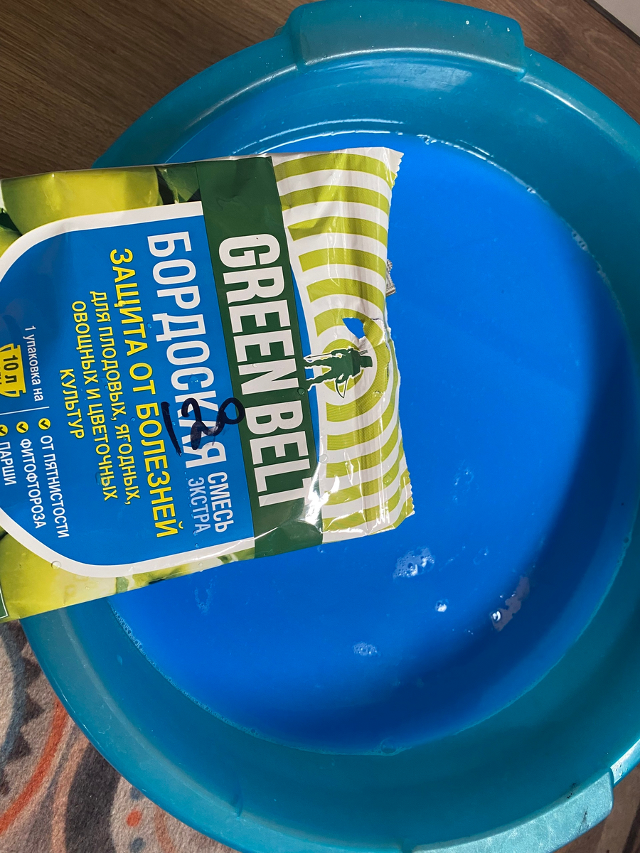 Я успела! Успела обработать кусты и деревья от всяческих поганых болезней. Очень качественно разводила пакетик с медным купоросом, ещё тщательнее пакетик с известью, приливала синий раствор к белому, все по инструкции.