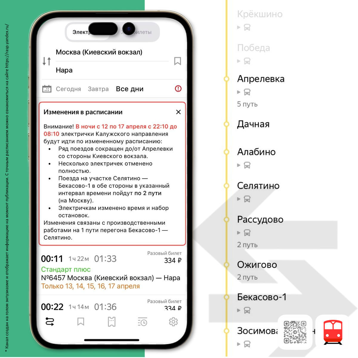 В ночи с 12 по 17 апреля с 22:10 до 08:10 электрички Калужского направления будут идти по измененному расписанию: ➡️ Ряд поездов сокращен до/от Апрелевки со стороны Киевского вокзала. ➡️ Несколько электричек отменено полностью. ➡️ Поезда на участке Селятино — Бекасово-1 в обе стороны в указанный интервал времени пойдут по 2 пути (на Москву). ➡️ Электричкам изменено время и набор остановок. Изменения связаны с производственными работами на 1 пути перегона Бекасово-1 — Селятино.