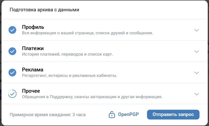 Время формирования архива, в зависимости от объема информации, варьируется от нескольких часов до нескольких дней. Когда архив будет готов, пользователь в сообщениях получит ссылку на скачивание. В целях безопасности такой ссылкой можно воспользоваться только из собственного профиля в течение 7 дней.