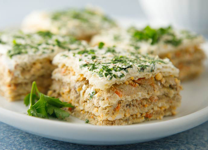 Этот рецепт Елены Ниловой лишний раз доказывает, что при большом желании и хорошей смекалке можно из самых простых продуктов готовить необыкновенно вкусные блюда. Ингредиенты: 4 вафельных коржа (здесь прямоугольные), 250 г творожного сыра, 3 яйца, 2 ст. ложки майонеза, пучок зелени (петрушка, укроп, зеленый лук), соль, перец. Для начинки: 2 свежемороженых скумбрии, 2-3 моркови, 2 луковицы, лавровый лист, душистый перец, растительное масло, лимонный сок, вустерский соус (по желанию). Лук и морковь очищаем, некрупно нарезаем и тушим на растительном масле до мягкости. Сваренные вкрутую яйца держим в холодной воде, очищаем от скорлупы, а затем мелко рубим или хорошенько разминаем вилкой. Для начала рыбу следует разморозить. Затем удаляем у нее голову, хвост, плавники. Далее потрошим и хорошо промываем. Разрезаем каждую скумбрию на две-три части, укладываем их в кастрюлю, заливаем водой, добавив лавровый лист и душистый перец. Ставим кастрюлю на огонь, доводим до кипения и варим 10-12 минут