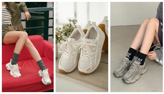 Особенно актуальны модели с сеткой и лёгкой текстурой — они выглядят современно и не утяжеляют образ. Бежевые, молочные, серые кроссовки выглядят максимально «чисто»