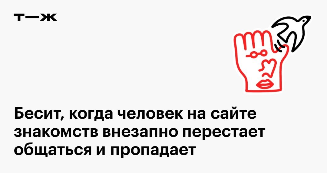 Я испробовал «Тиндер», «Твинби», «Пьюр». Проблема гостинга везде стоит очень остро и заставляет каждый раз переживать по поводу пропажи человека из переписки. Согласиться или поспорить с автором можно здесь: https://t-j.ru/m-tg/chelovek-vnezapno-perestaet-obshchatsia-i-propadaet-hate/ Бесит? 💔 — Очень 🤷♀️ — Не обращаю на это внимания 🤗 — Не сталкиваюсь с таким 🗿 — Я пропадаю из переписок