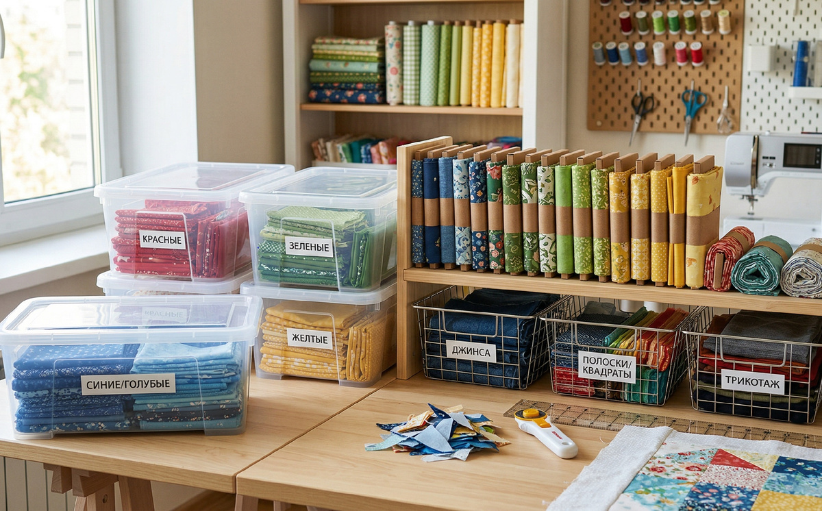 У каждой рукодельницы есть этот «запретный шкаф» или таинственный пакет, где остатки тканей живут своей тайной жизнью. Сначала это просто пара симпатичных обрезков, но со временем они превращаются в лавину, которая грозит вытеснить хозяйку из комнаты. Но лоскутки - это не мусор, а ценный ресурс. Главное, найти систему, которая превратит хаос в рабочий инструмент. Прежде чем раскладывать ткани по полкам, стоит провести честную ревизию. Весь ворох делится на три понятные группы: Визуальный порядок творит чудеса с настроением. Когда лоскутки рассортированы по цветам, мастерская приобретает опрятный вид. Если места мало, а тканей много, на помощь приходит логистика. Обычные стопки - это ловушка: стоит вытянуть нижний кусок, как вся конструкция рушится. Вертикальный порядок (Метод картотеки):