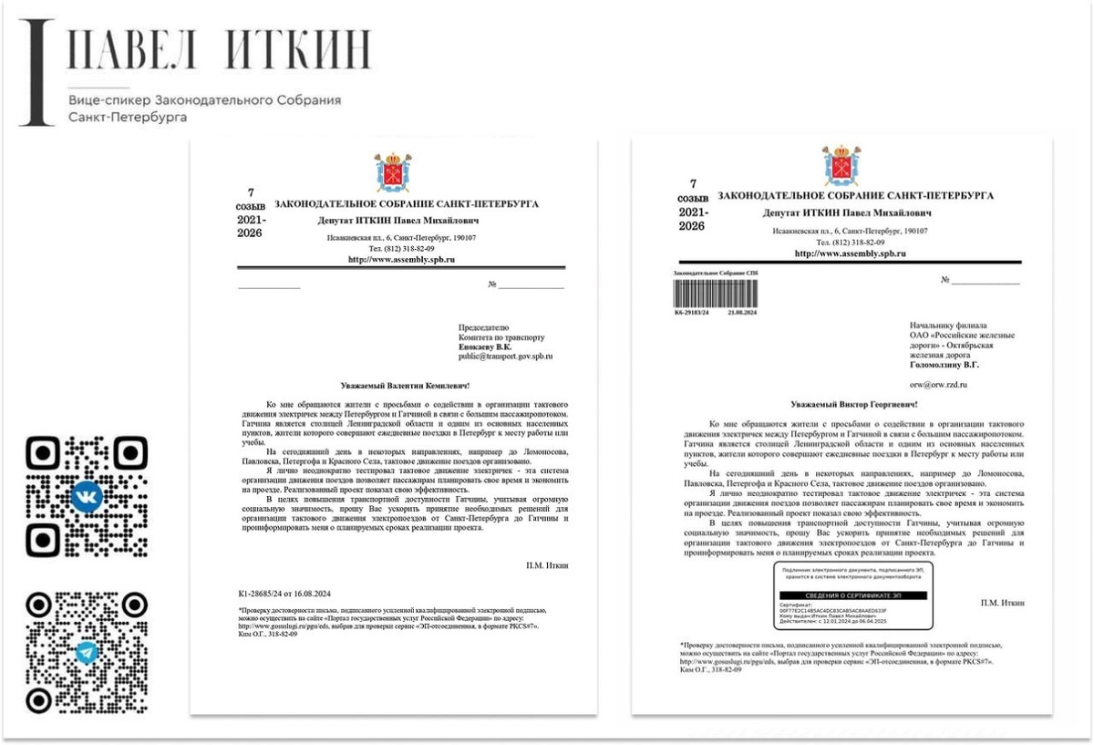 В 2024 году я направил обращения Председателю Комитета по транспорту Вадиму Константиновичу Енокаеву и начальнику Октябрьской железной дороги Виктору Георгиевичу Голомолзину с просьбой ускорить решение по внедрению тактового движения электричек. По другим направлениям вопрос решался проще, так как Пушкин, Ломоносов и Зеленогорск находятся на территории Санкт-Петербурга, а Гатчина — в Ленинградской области. Гатчина — столица Ленинградской области, пассажиропоток здесь значительный: люди ежедневно совершают поездки на работу и учёбу в Санкт-Петербург. При этом тактовое движение на данном направлении длительное время отсутствовало. В своих обращениях я обосновал социальную значимость проекта, привёл в пример направления на Ломоносов, Павловск и Красное Село, где тактовое движение уже реализовано и доказало свою эффективность, а также отметил положительный личный опыт пользования этой системой. Инициатива получила поддержку. С 6 апреля между Санкт-Петербургом и Гатчиной запущено тактовое
