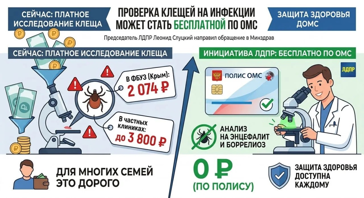 👉🏻 ЛДПР предложила включить экспресс-тестирование клеща после укуса в программу ОМС. Суть инициативы простая: чтобы исследование на клещевой энцефалит, боррелиоз и другие инфекции можно было сделать бесплатно, без лишней финансовой нагрузки на пациента. Это пока именно предложение, а не уже принятая норма. 🧠 Почему тема вообще поднялась Сейчас по ОМС человеку обычно гарантированы осмотр и удаление клеща, а в ряде случаев — экстренная профилактика клещевого энцефалита иммуноглобулином. Но специфической профилактики против боррелиоза нет, поэтому раннее выявление риска особенно важно. 🔬 Что даёт анализ клеща Лабораторное исследование помогает понять, есть ли в клеще возбудители клещевого энцефалита, боррелиоза, анаплазмоза или эрлихиоза. Это не отменяет осмотр врача, но помогает точнее выбрать тактику наблюдения и лечения. ⚖️ Практический смысл инициативы Если анализ станет частью ОМС, пациенту не придётся тратить время на поиск платной лаборатории и решение «вслепую» после укуса.