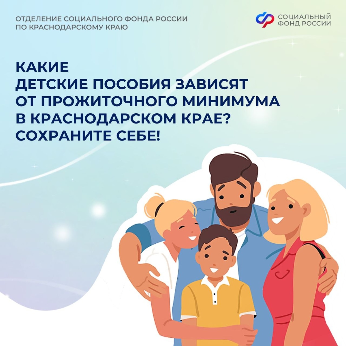 ! 📌 Прожиточный минимум устанавливается по всей России и отдельно по каждому региону. Эта величина влияет на разные социальные выплаты, включая поддержку семей с детьми. 🔍 Как прожиточный минимум Краснодарского края связан с детскими пособиями? Смотрите в наших карточках! 📣 Поделитесь с родителями, кто планирует оформлять выплаты или хочет разобраться в условиях! 👨👩👧👦 ☎️🏠 Если остались вопросы, то всегда можно обратиться в единый контакт-центр СФР 8(800)100-00-01 или лично в клиентскую службу Отделения СФР по Краснодарскому краю. 📲👉 Подписывайтесь на наш канал в MAХ и будьте в курсе всех мер соцподдержки 🔥 #СФР #единоепособиесфр #маткапсфр #семейнаявыплатасфр